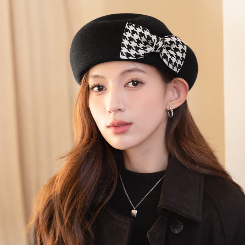 Women's Artist Cap/Beret All-matching Hat with Checkered Bow